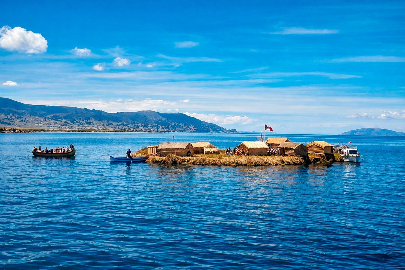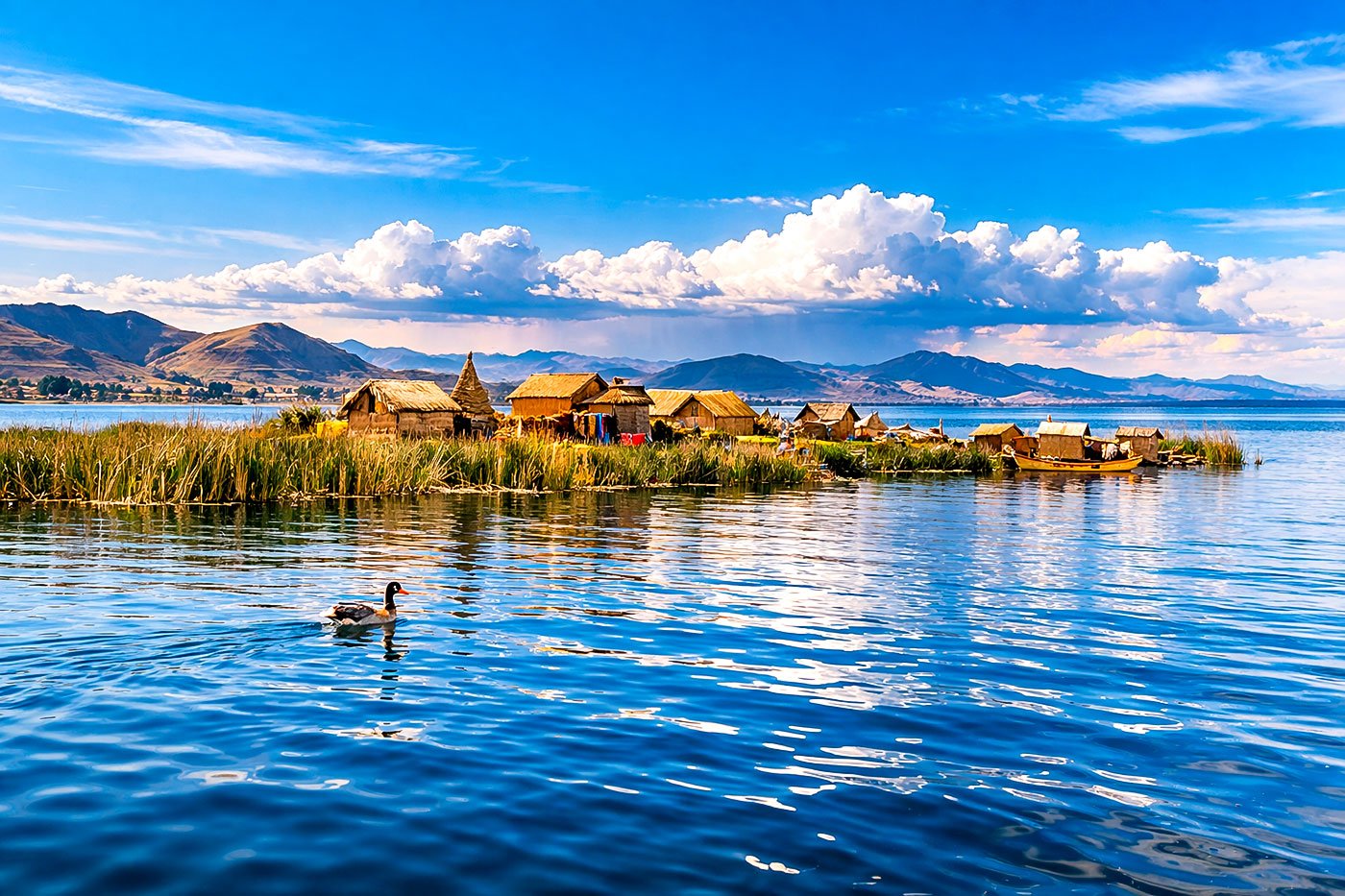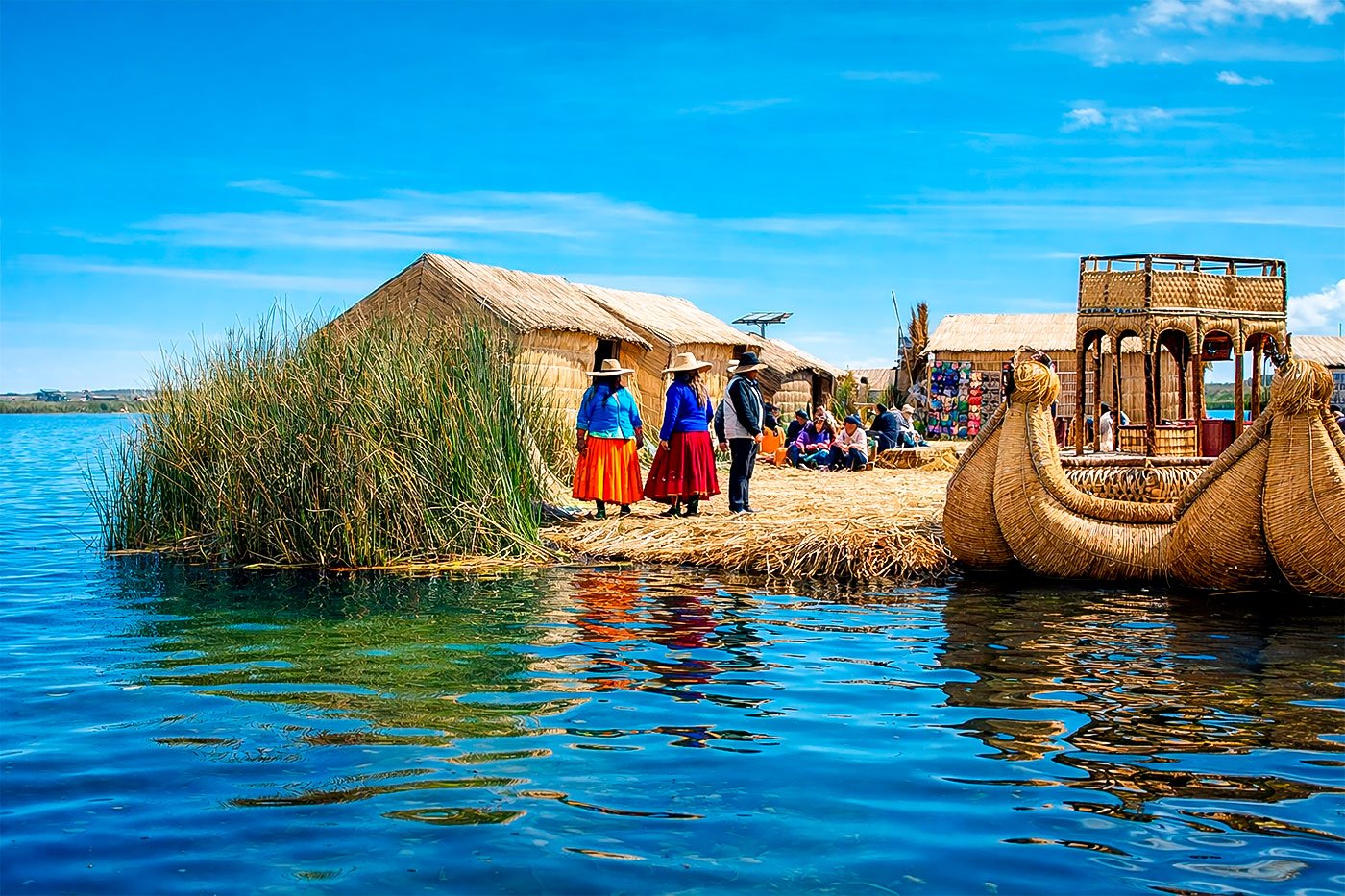 Navegación por el Lago Titicaca, el lago navegable más alto del mundo. La primera visita será a las Islas Uros, una ancestral comunidad que habita islas flotantes construidas artesanalmente con totora, una planta acuática propia del lago.